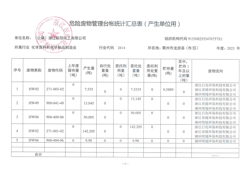 危險廢物管理臺帳統計匯總表(產生單位用)