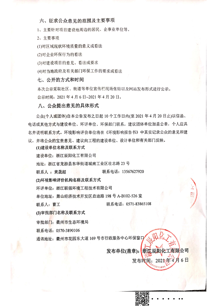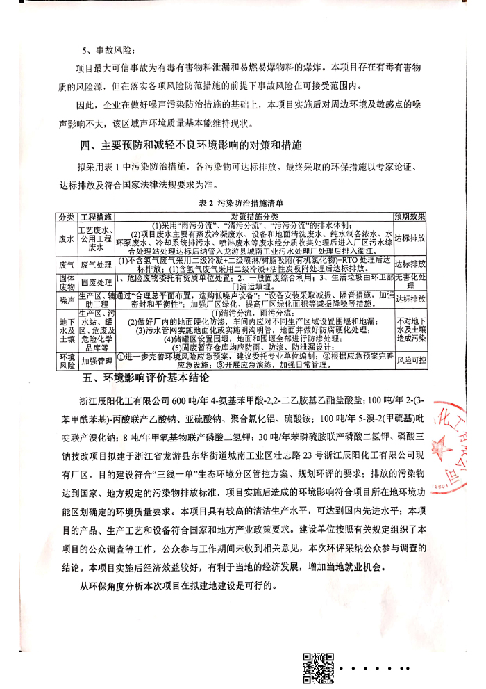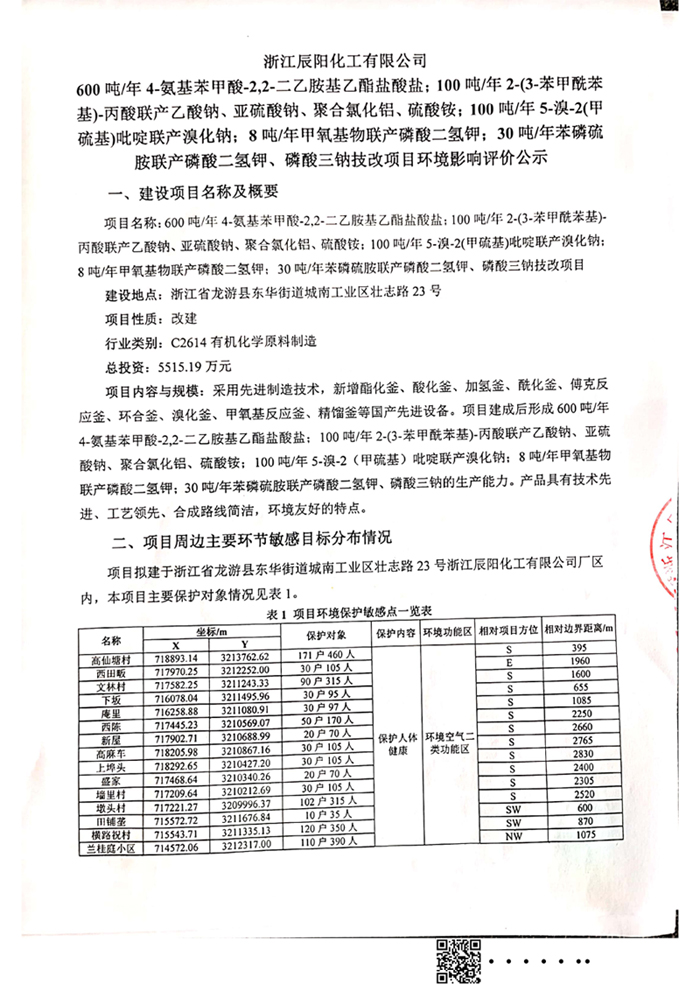 浙江辰陽化工有限公司600噸/年4-氨基苯甲酸-2,2-二乙胺基乙酯鹽酸鹽;100噸/年2-(3-苯甲酰苯基)-丙酸聯產乙酸鈉、亞硫酸鈉、聚合氯化鋁、硫酸銨;100噸/年5-溴-2(甲硫基)吡啶聯產溴化鈉;8噸/年甲氧基物聯產磷酸二氫鉀;30噸/年苯磷硫胺聯產磷酸二氫鉀、磷酸三鈉技改項目環境影響評價公示